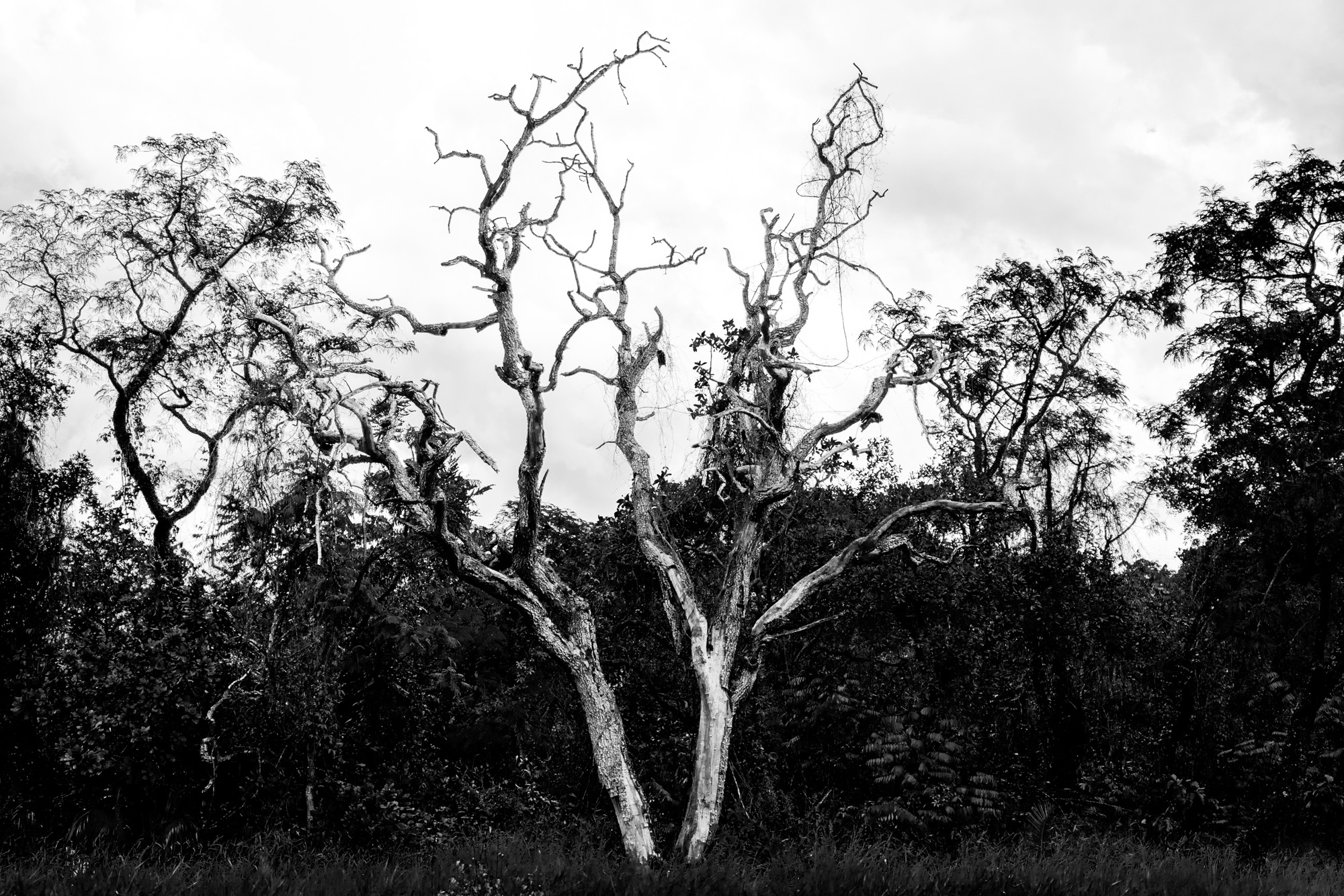 I see the branches of these dead trees pointing to the heavens as in a cry of protest for being isolated from the forest. And so they remain standing for many years, resisting time and screaming at those who have promoted their death.